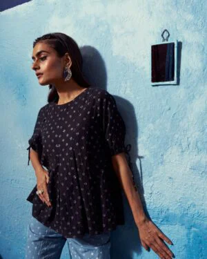 The Yamika Top is crafted in soft Bandhej, balancing structure with ease. A round neckline and gently pleated front create quiet refinement, while dori-tied sleeves add a touch of artisanal detail. The silhouette flares subtly at the hem, flowing with comfort and timeless grace. A versatile?Bandhej piece for every mood.